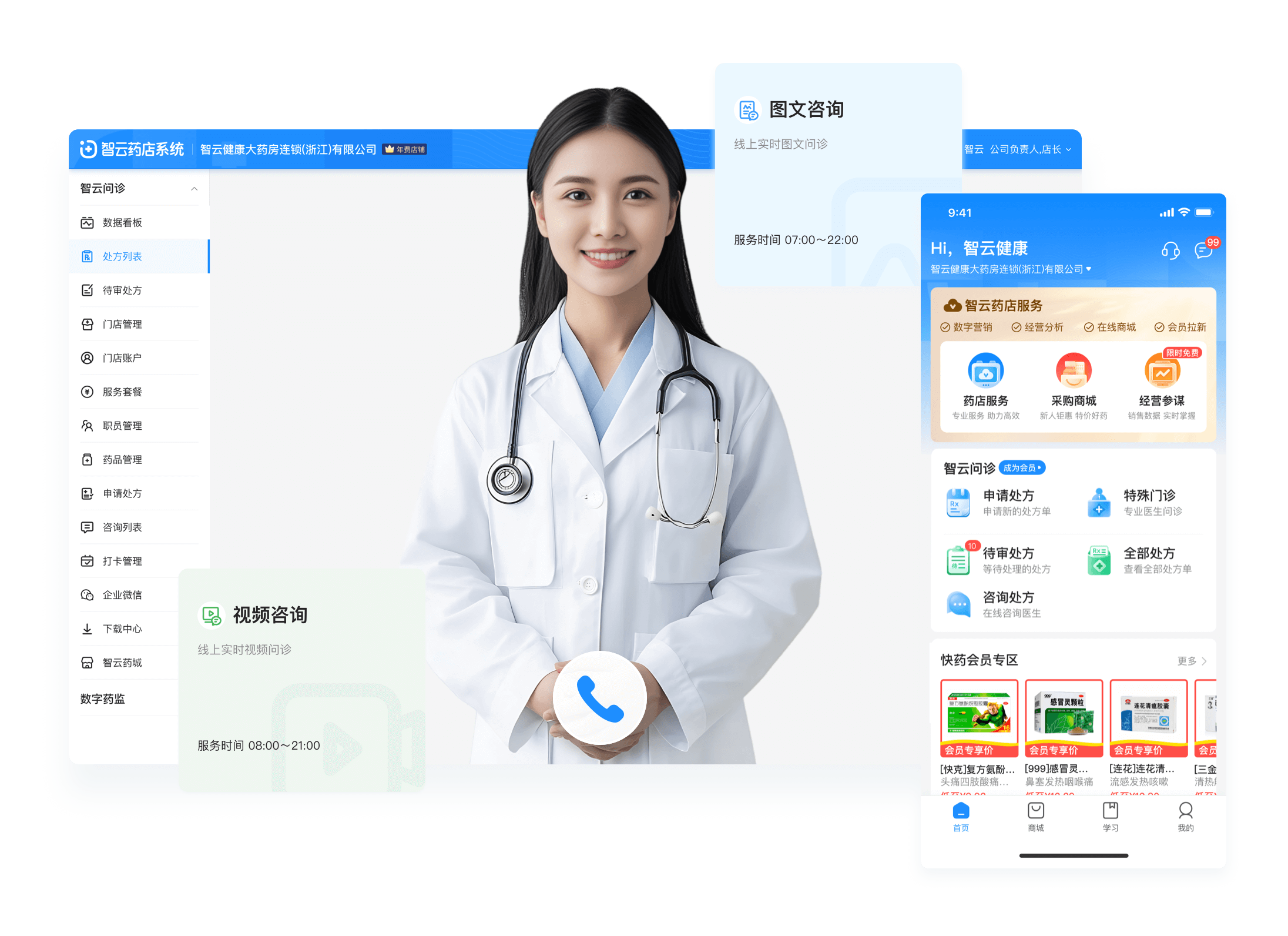 智云问诊是专为药店打造的SaaS平台。药店可在智云互联网医生帮助下,通过智云问诊迅速、合规为购药用户开具处方药,实现安全、优质、高效的处方流转管理,为购药用户和药店间搭建完善的服务桥梁
