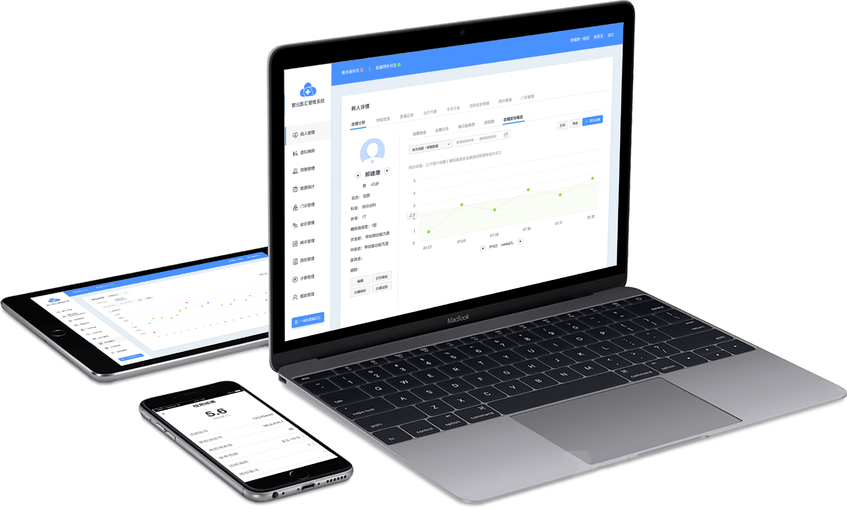 通过对数据的权限分类,院内医护可随时随地查看对应患者的血糖数据 Based different data permissions,doctors and nurses can check blood sugar data of patients in the system